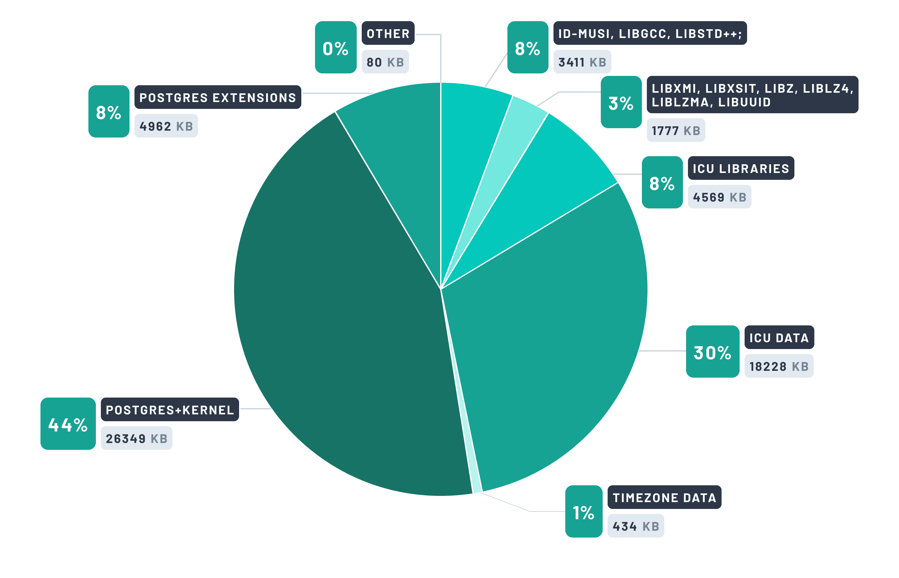 Unikraft 团队成功地将原始 PostgreSQL 镜像从 280MB 裁剪到 61MB。以下是 Prisma Postgres 镜像的组件分解: