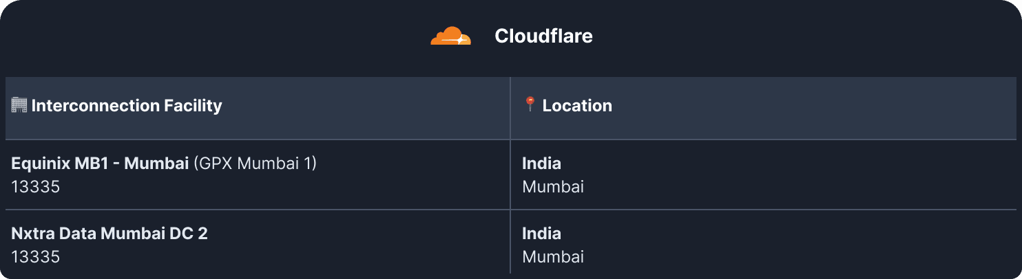 Cloudflare BOM(孟买)PoP 也在 Equinix MB1 设施进行对等互联,因此 Cloudflare 和 AWS 在孟买的设施之间的网络距离非常短。