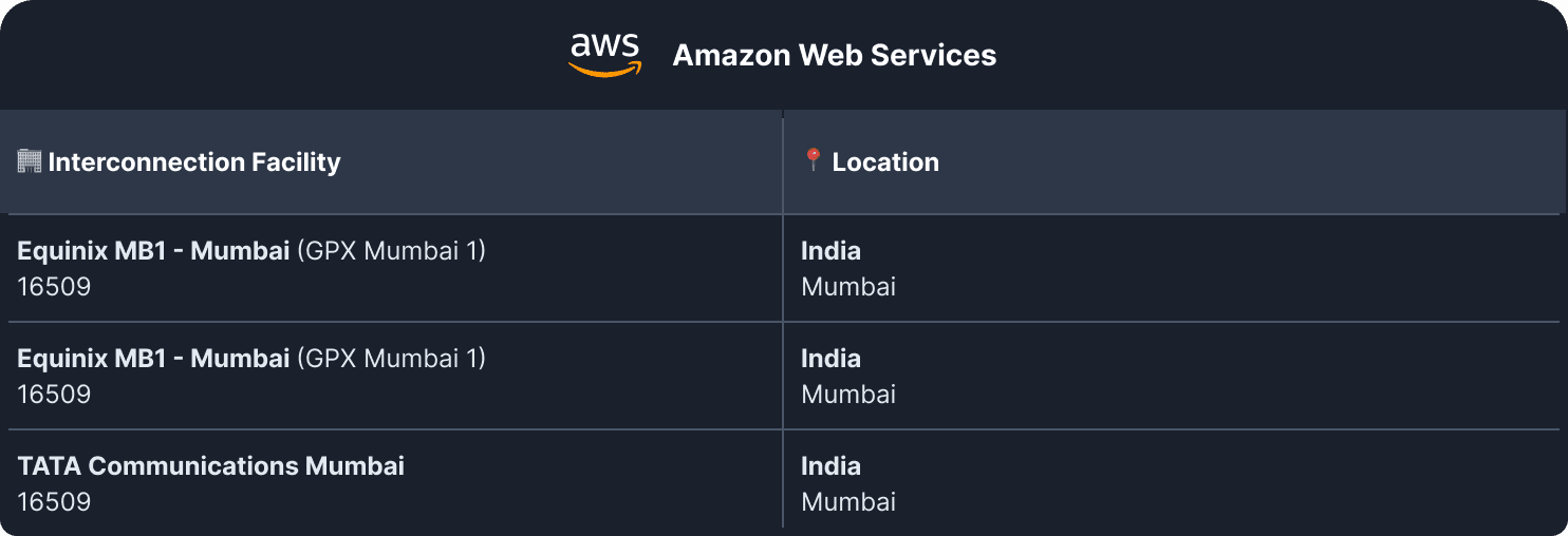 要了解为什么某些 AWS 区域能够以极低的延迟访问 Cloudflare PoP,您只需“追根溯源”即可。归根结底,这些都是通过光纤在互联设施连接起来的物理网络。例如,ap-south-1(孟买)AWS 区域在三个设施进行对等互联。