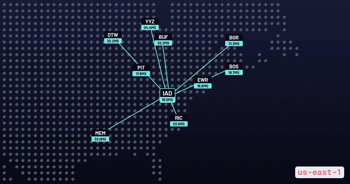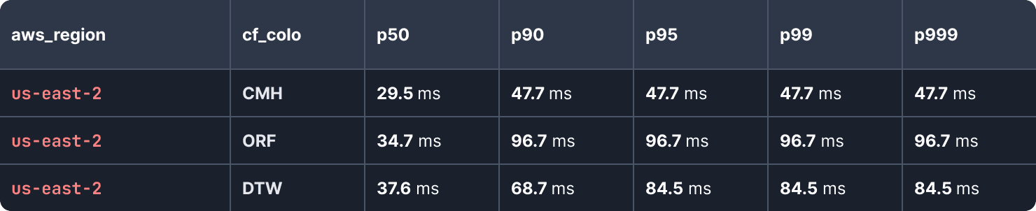 相比之下,俄亥俄州哥伦布市的 us-east-2 AWS 区域与同样位于哥伦布市的最近的 Cloudflare PoP CMH 的 p50 延迟几乎是其三倍。
