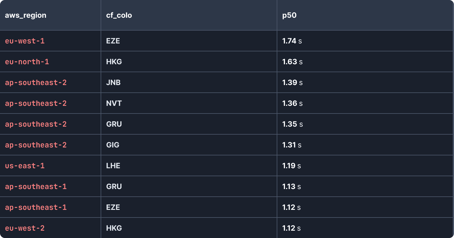 Prisma Accelerate 是一个全球数据库缓存,可提高部署在多个区域并与中心数据库通信的网站的性能。因此,我们观察到几乎所有 Cloudflare PoP 到任何指定 AWS 区域的流量。以下是我们观察到延迟最高的 AWS 区域和 Cloudflare PoP 对: