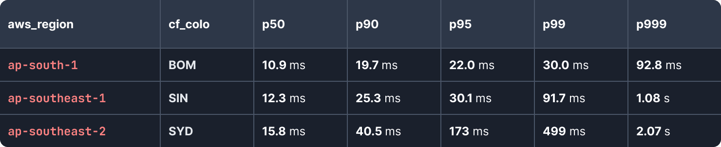其中最快的是 ap-south-1(孟买)区域,于 2016 年开放,与附近的 Cloudflare BOM PoP 的 p50 延迟为 10.9 毫秒。其次是 ap-southeast-1(新加坡)区域,于 2010 年开放,与附近的 SIN PoP 的 p50 延迟为 12.3 毫秒。最后是 ap-southeast-2(悉尼)区域,于 2012 年开放,与附近的 SYD PoP 的 p50 延迟为 15.8 毫秒。