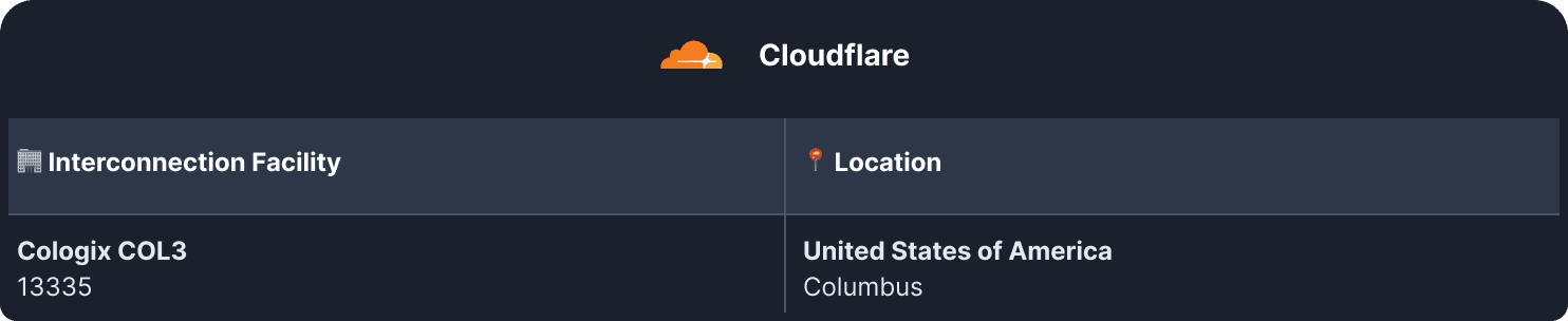 Cloudflare 在哥伦布也有一个 PoP,但它在不同的 Cologix 设施进行对等互联,导致额外的网络跳数。