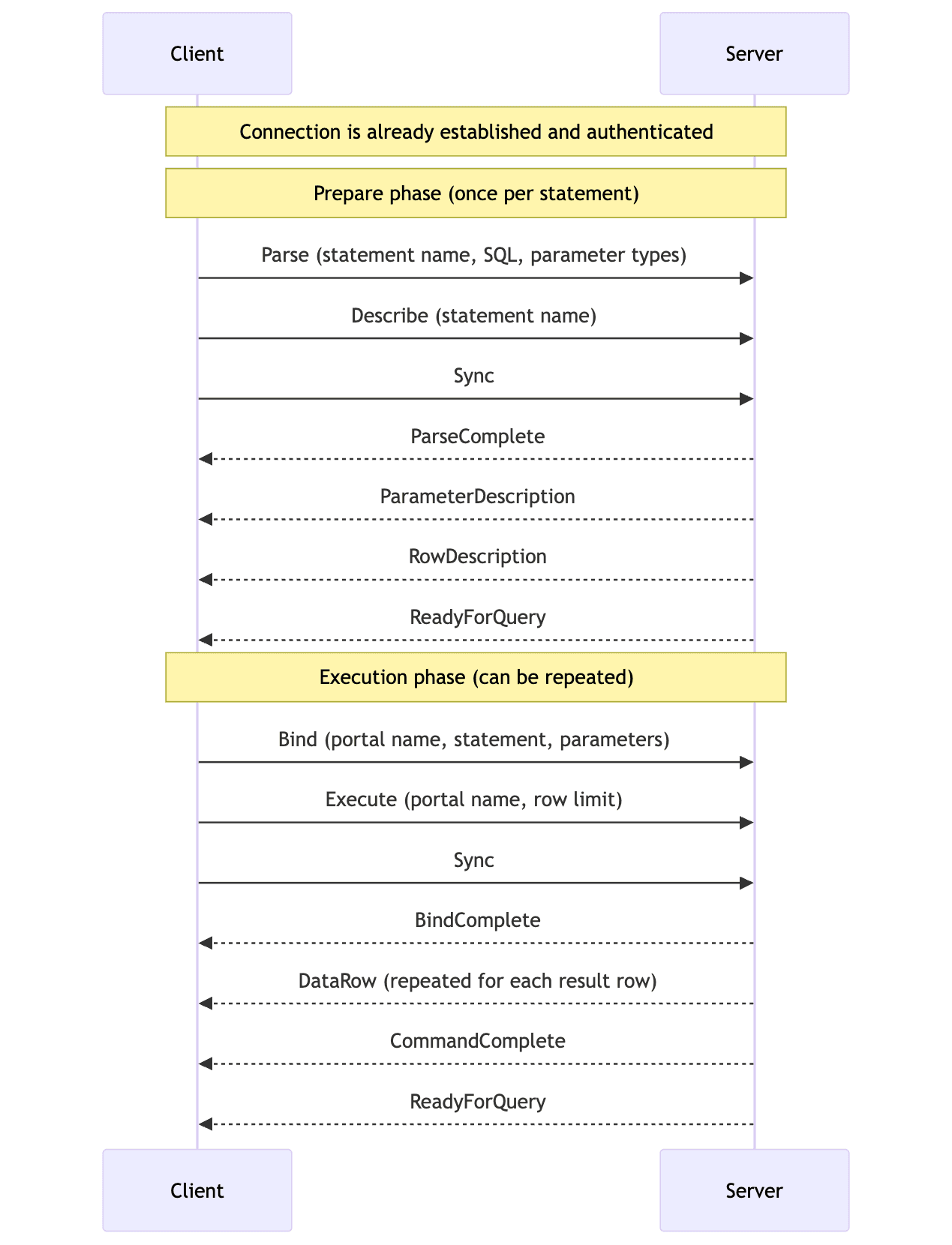 在执行第一个查询之前,网络上总共有18条消息!我们再来看看如何准备查询。有两种方法:简单查询协议和扩展查询协议。应用程序通常使用扩展查询协议,因为它支持参数化查询以防止SQL注入,所以我们将重点放在那里。