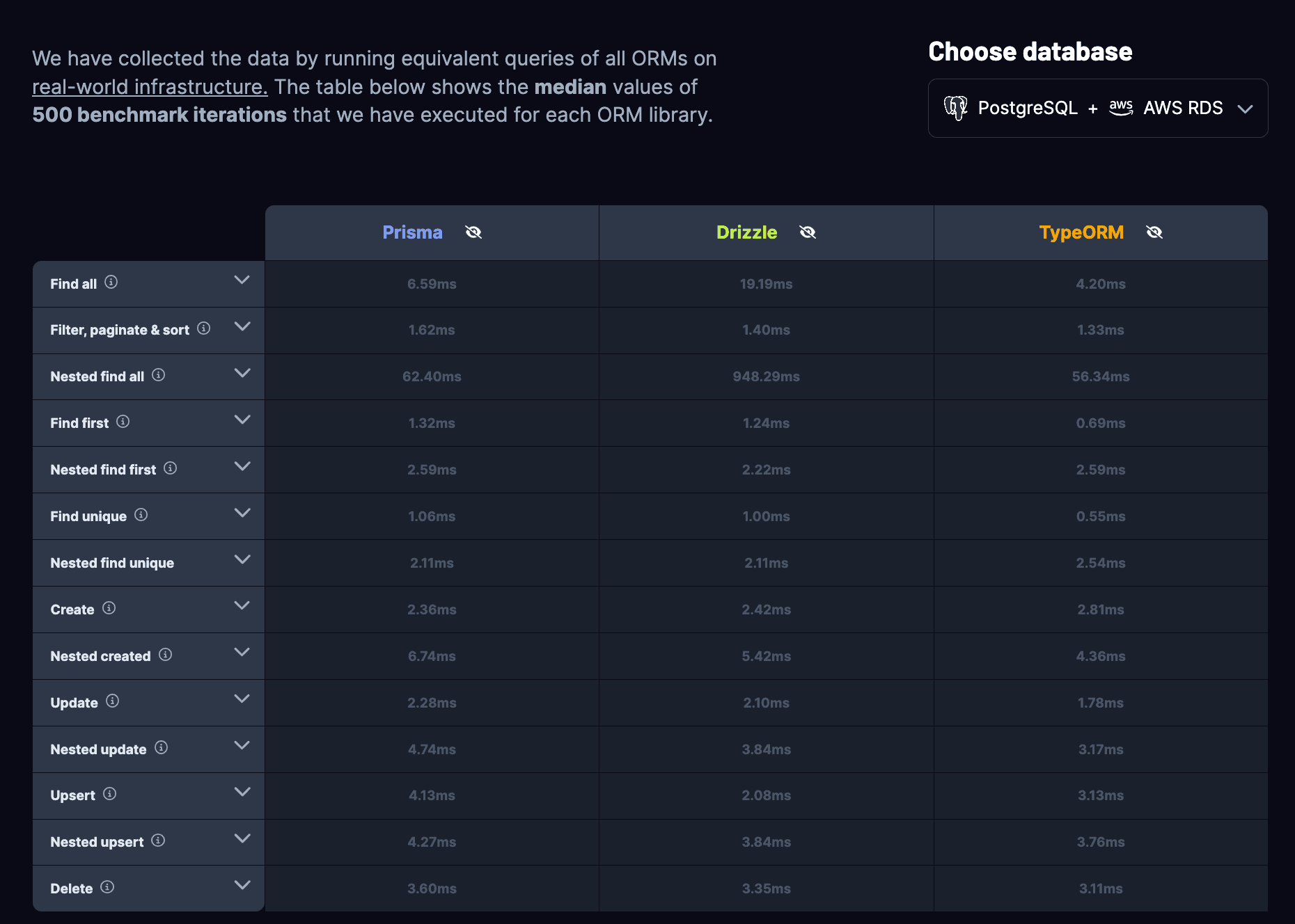 我们创建了开源性能基准测试,用于比较 Prisma ORM、TypeORM 和 Drizzle ORM 在不同数据库提供商(如 AWS RDS 上的 PostgreSQL、Supabase 和 Neon)上的查询延迟。请继续阅读,了解我们的方法论以及哪个 TypeScript ORM 最快。