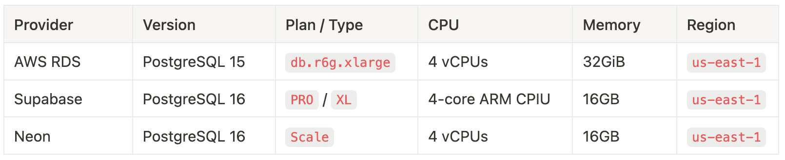大概 RDS 具有优势,因为基准测试脚本是在同一安全组内的 EC2 实例上执行的,而 Supabase 和 Neon 数据库则可通过公共互联网访问。