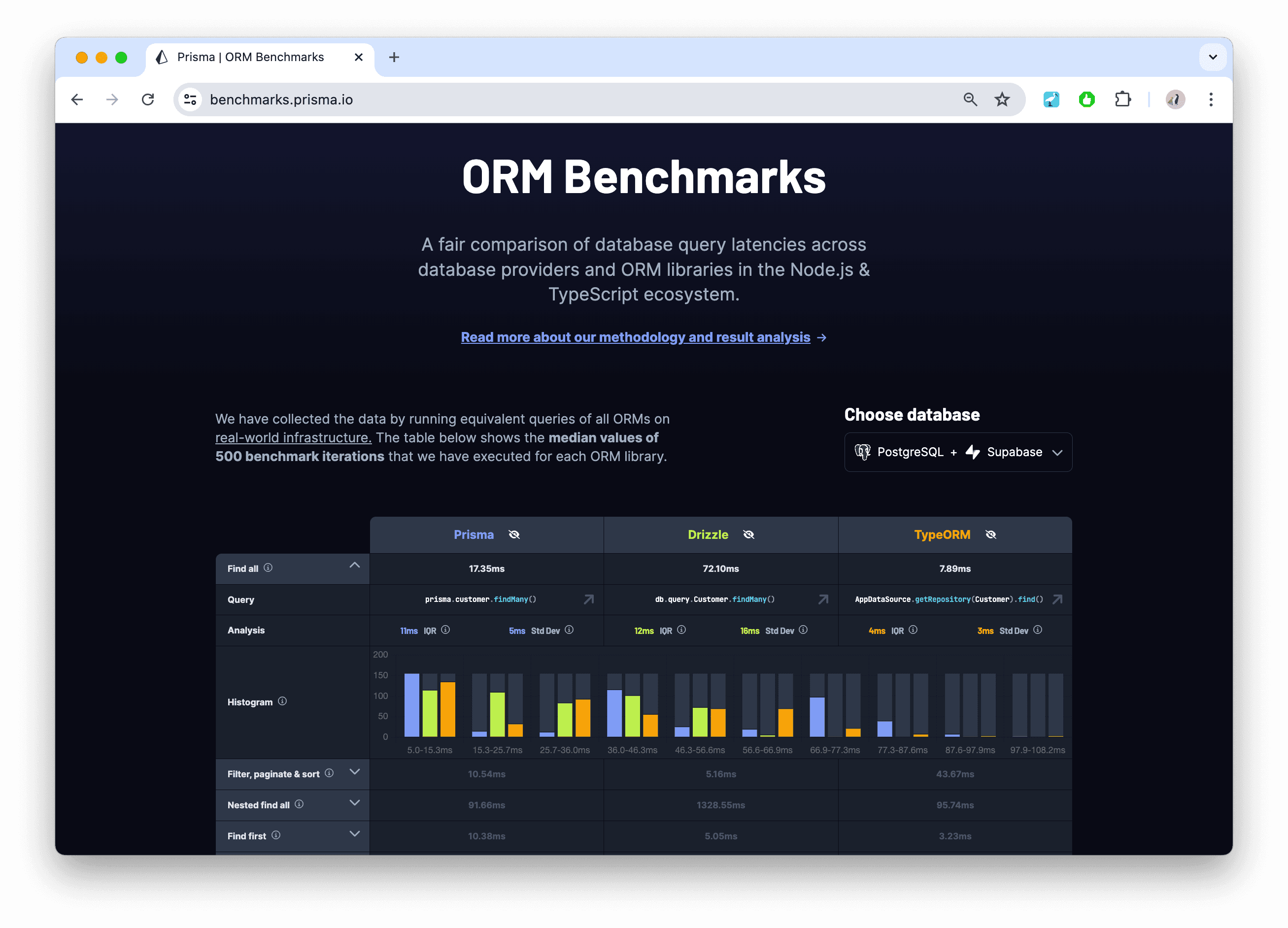您可以在https://benchmarks.prisma.io上找到我们的基准测试结果。查看它们,并在X和Discord上告诉我们您的想法。我们特别期待听到您认为如何能使这个基准测试对您更有帮助,并欢迎改进建议!