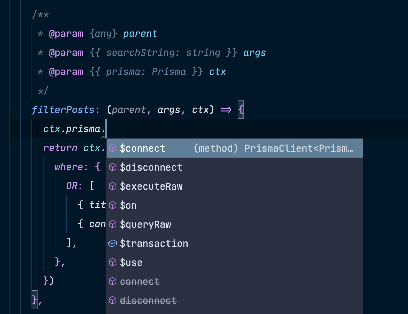 这将告诉 VS Code,context 有一个名为 prisma 的属性,并且其类型是上面 @typedef 中定义的 Prisma。