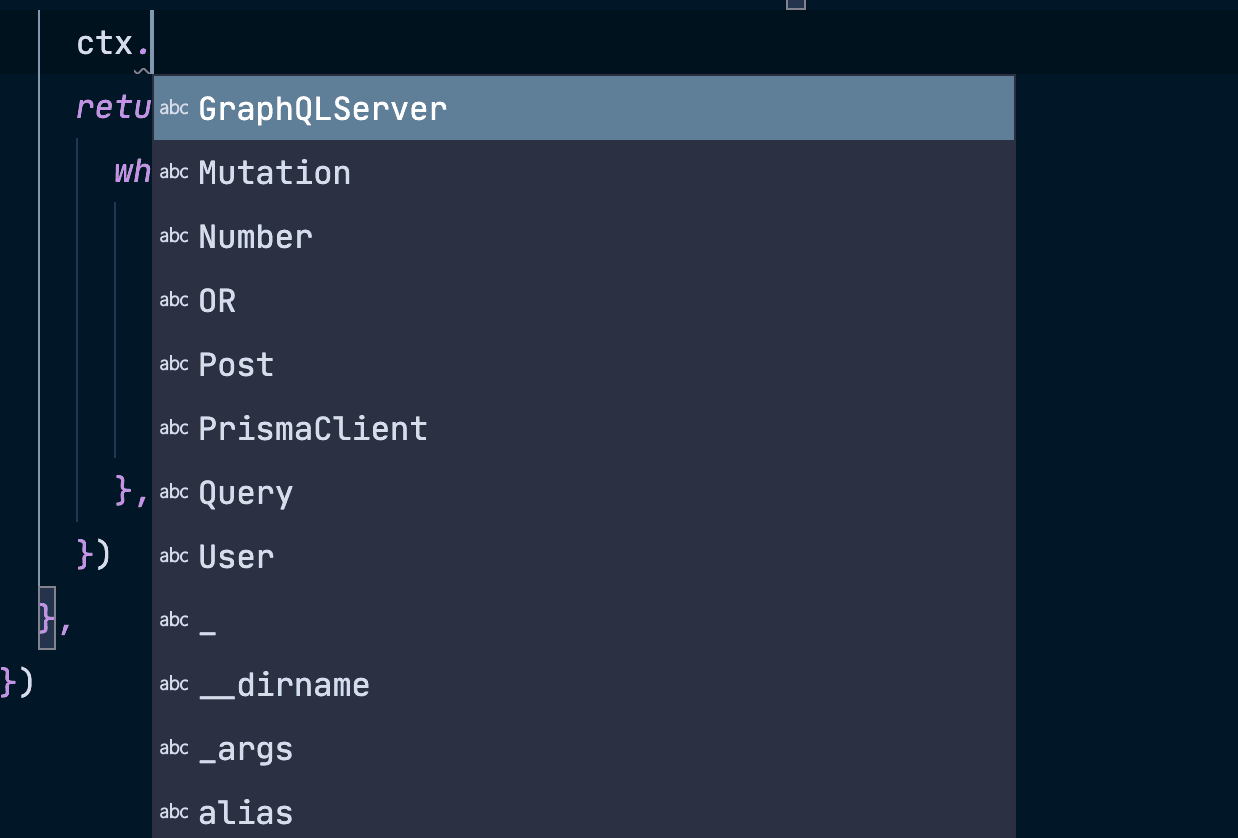 当将 GraphQL 与 TypeScript 结合使用时,您总能在 GraphQL 解析器中获得 Prisma Client 实例的自动补全,因为那时 context 对象可以被类型化——无论人们使用的是 Nexus、TypeGraphQL 还是 SDL first。这极大地有助于自动补全并防止不必要的错误。